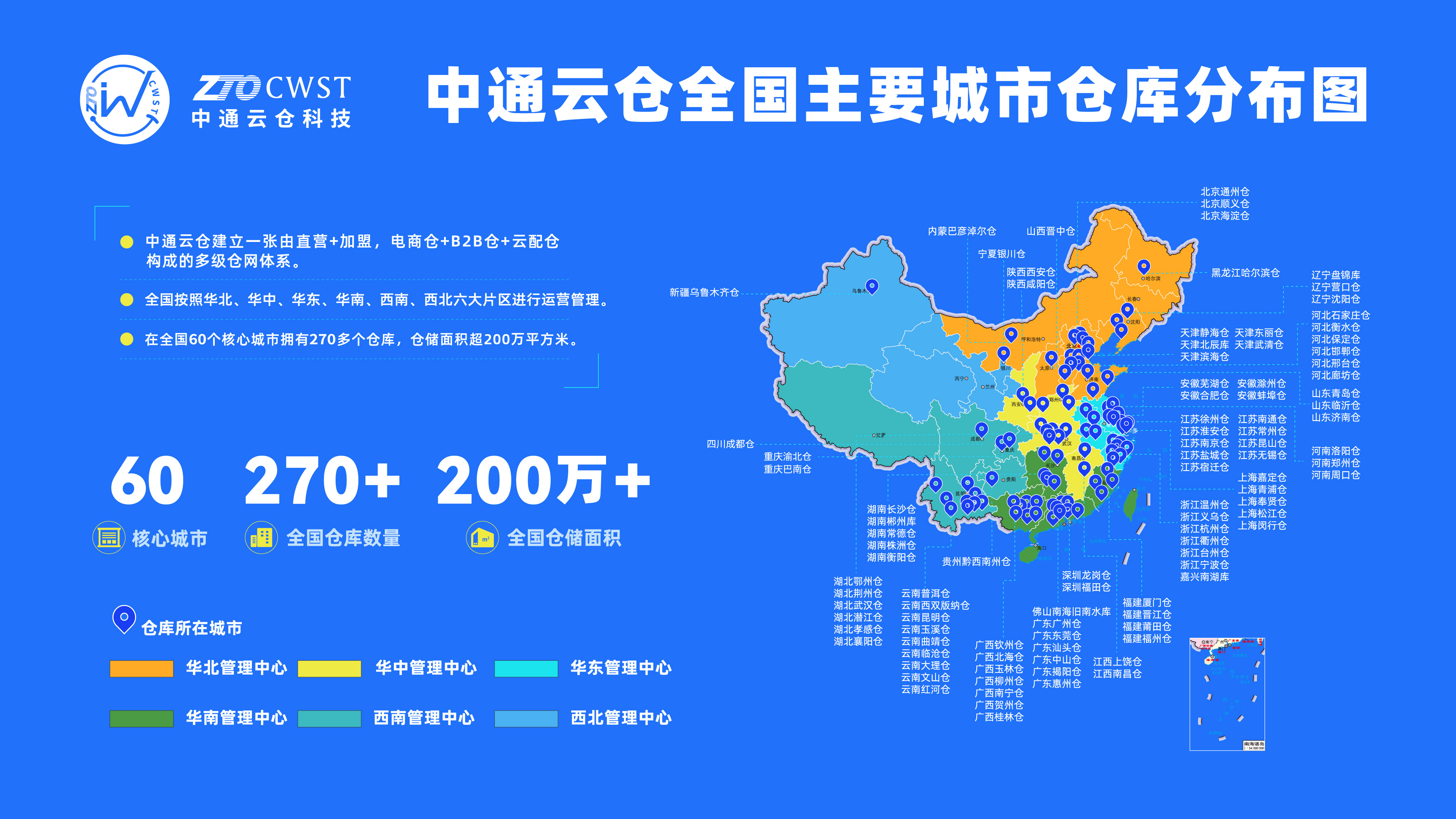 中通云倉科技建立了一張由直營+加盟,電商倉+B2B倉+云配倉構(gòu)成的多級倉網(wǎng)體系。全國按照華北、華東、華南、華中、西南、西北六大管理中心進(jìn)行運(yùn)營管理。在全國60個(gè)核心城市擁有270多個(gè)倉庫,倉儲(chǔ)面積超200萬平方米。了解更多